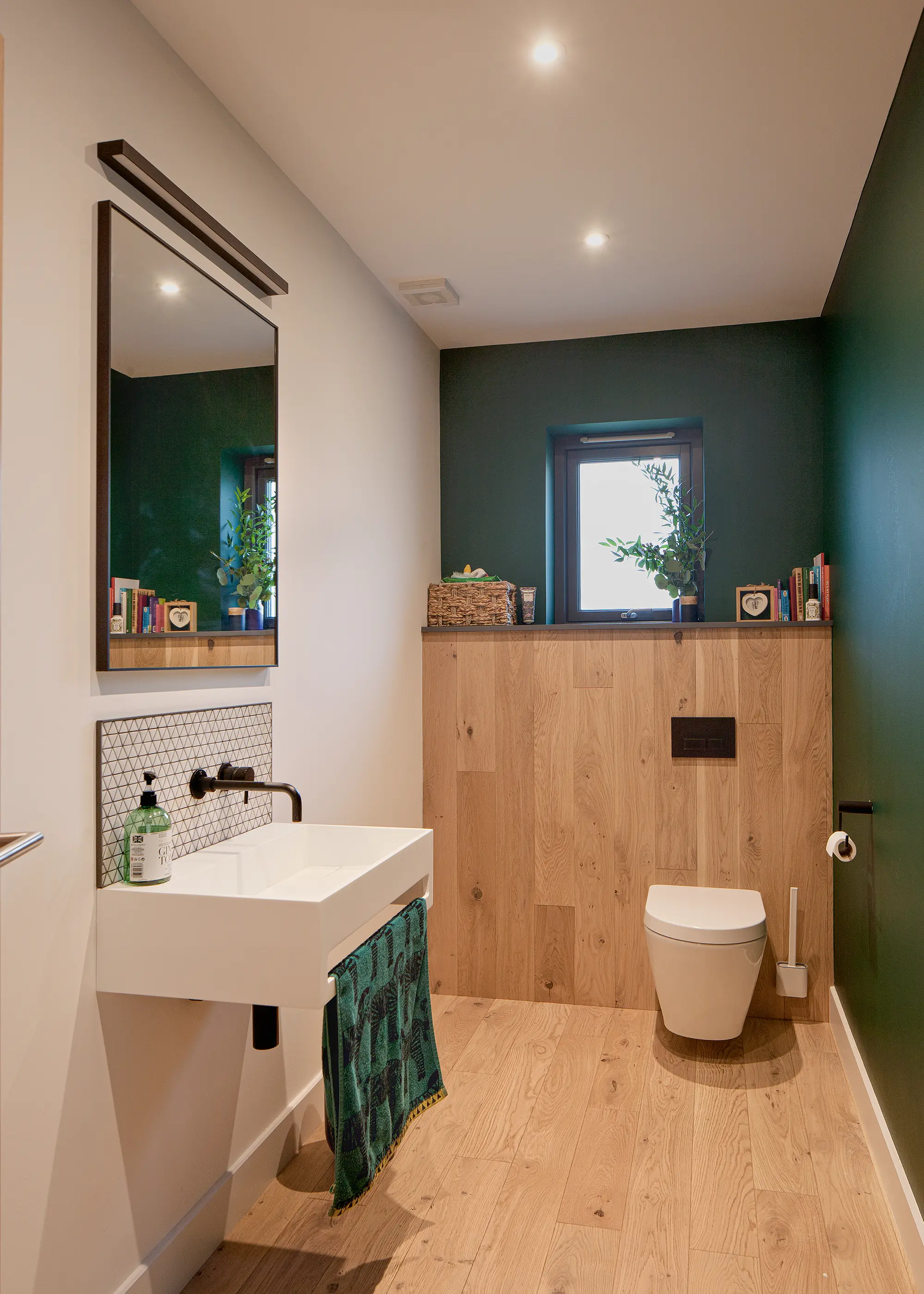 “The chosen timber floor was another cost-saving exercise, an alternative yet still high-quality product, but for a more affordable price versus the original specification,” says Finlay. “An additional wee design detail involving this was in the ground floor WC, where we ran the floor up behind the toilet instead of using tiles. Again, more cost-effective and it looks magic.”