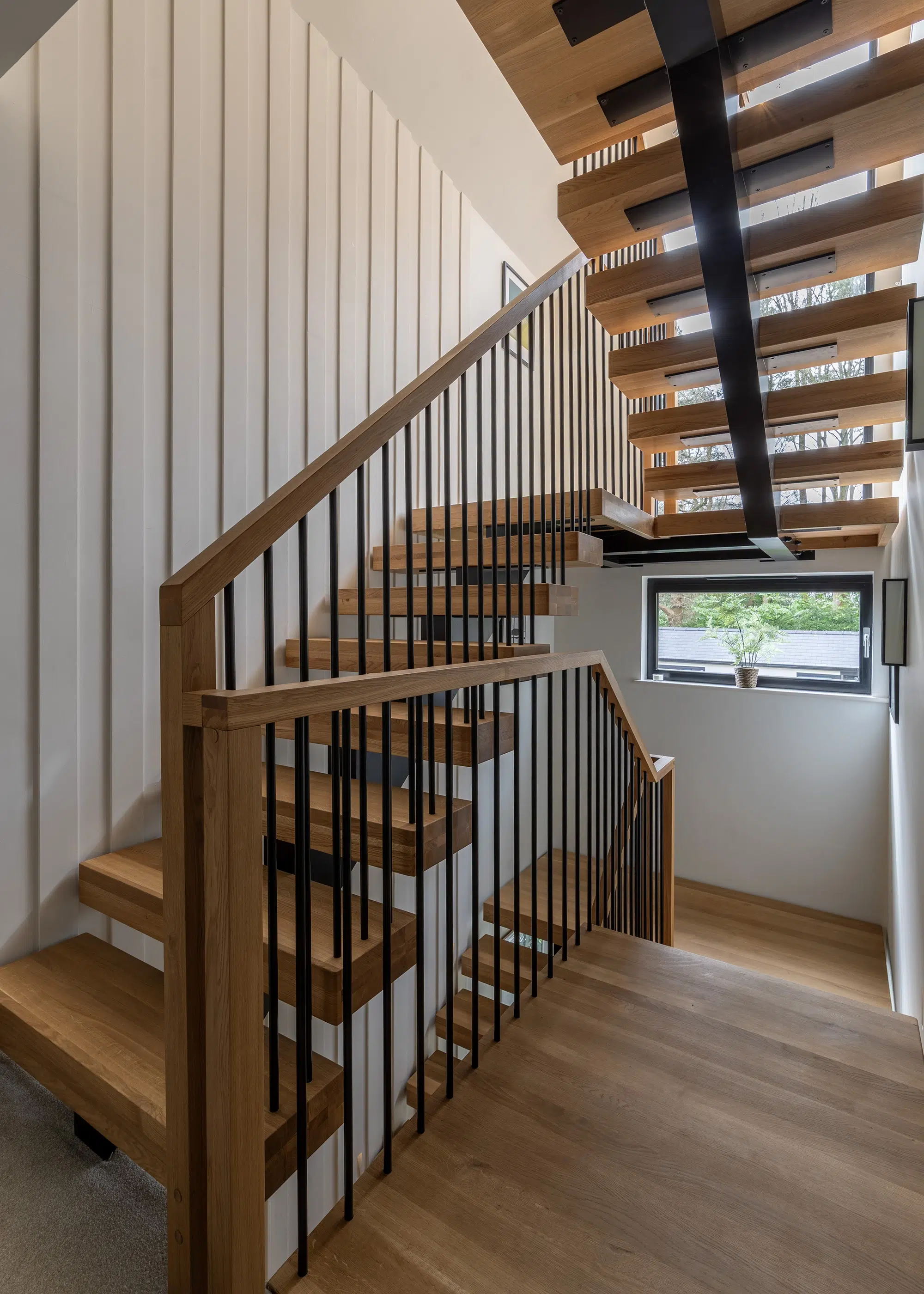 Designed by Max-Stairs, this bespoke staircase features a central metal spine with solid oak, 110mm steps. The spindles and core structure have been finished with a sleek black powder-coated finish