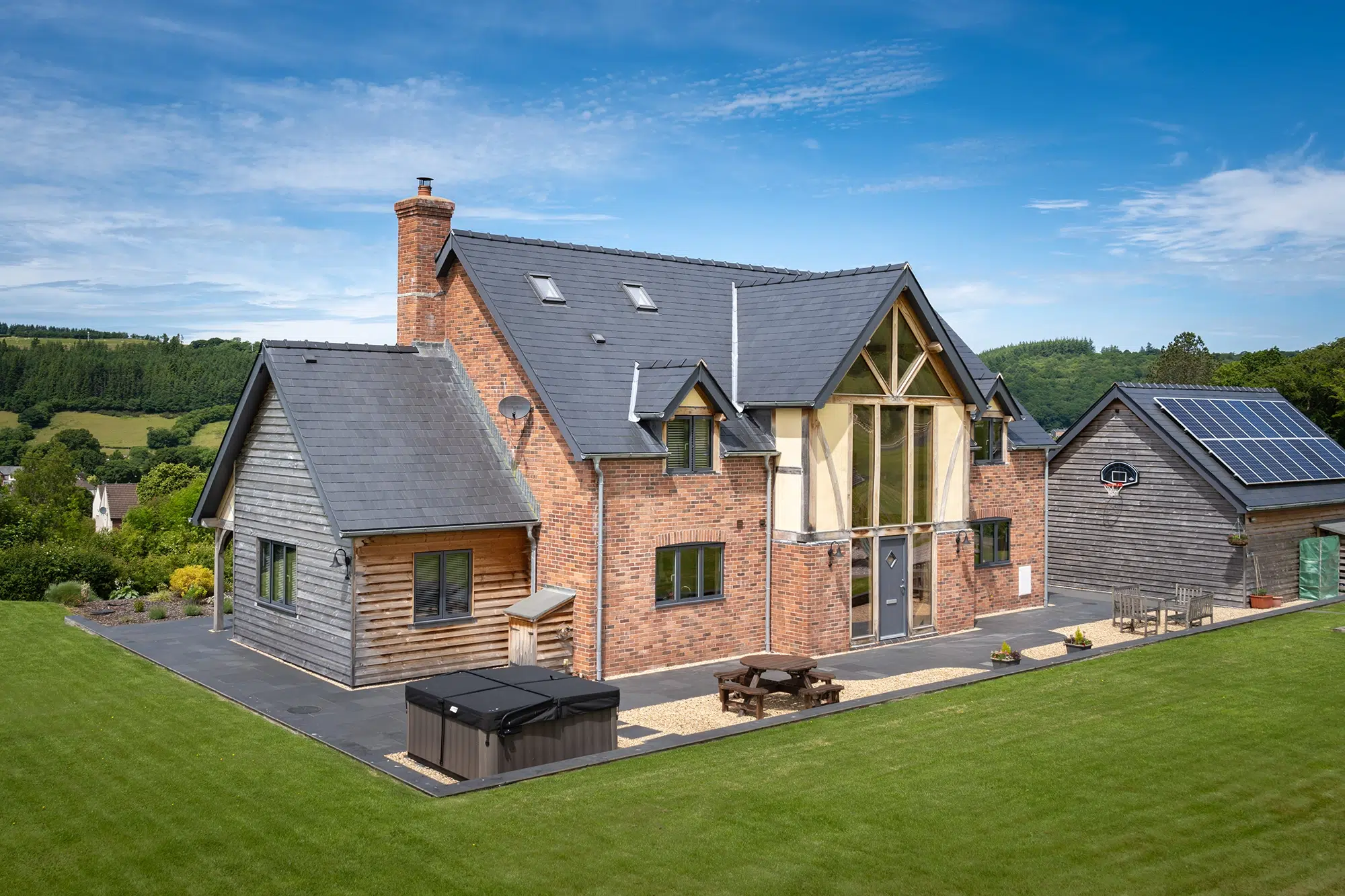 Delivered by Welsh Oak Frame, this handsome oak home features a varied external materials palette including timber weatherboarding, masonry and Tudor-style plaster with oak beams