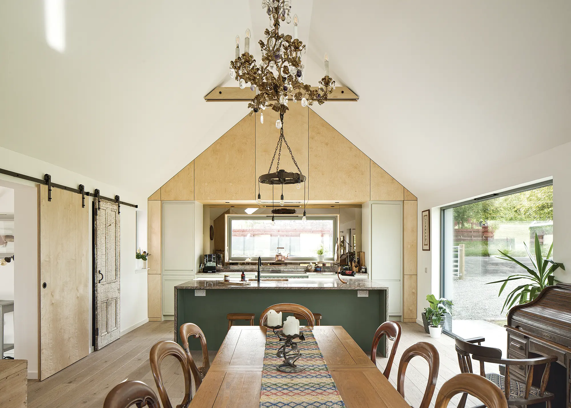 Fiona Henderson worked closely with Fiddes Architects and her contractors to source reclaimed materials for her self build. The kitchen features recycled pine units, old stable doors and striking lighting features. “I found the wheel to create the pendant light over the kitchen island in a field next to my old house,” says Fiona. Photo: David Barbour
