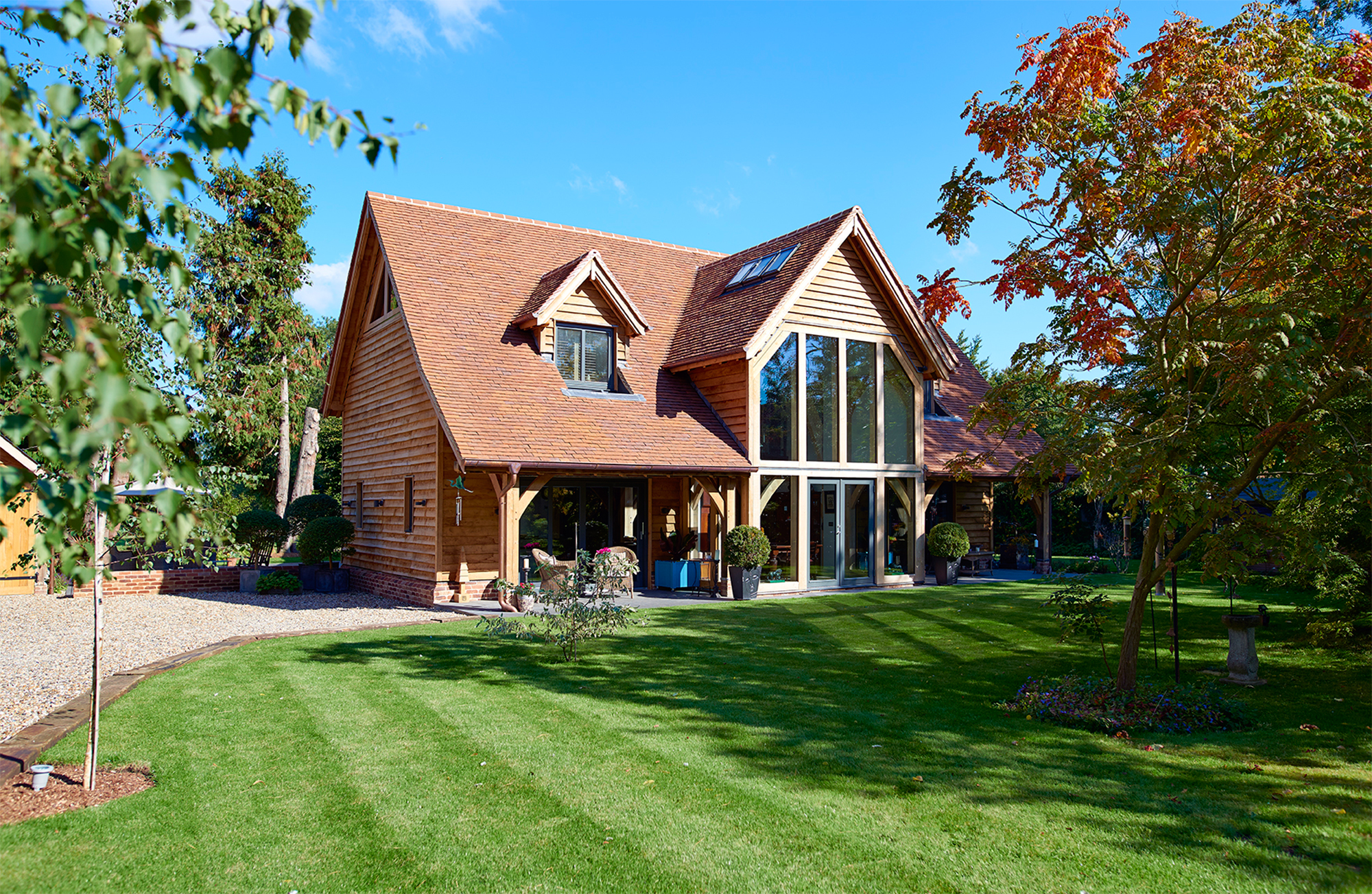Featuring large expanses of high-performance glass, this barn style oak home design was initially refused by the planners.